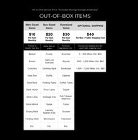 Select the out-of-box items you need services for: your out-of-box items are organized by size and will not be in a box due to items too large or no more space left in box.